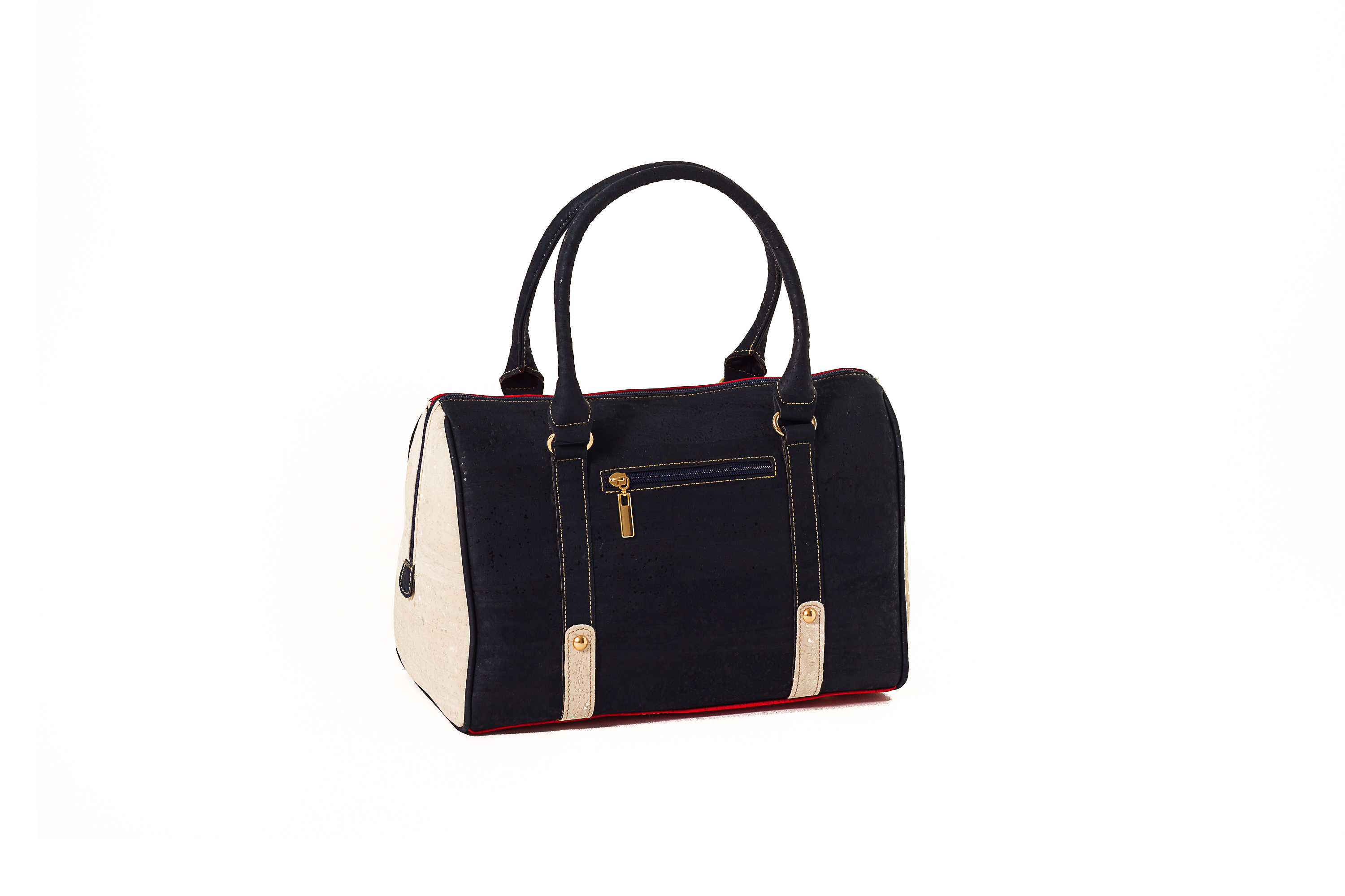 Mala em cortiça, que fecha com fecho eclair, com duas alças de mão.Um bolso de fecho eclair interior e outro interior.