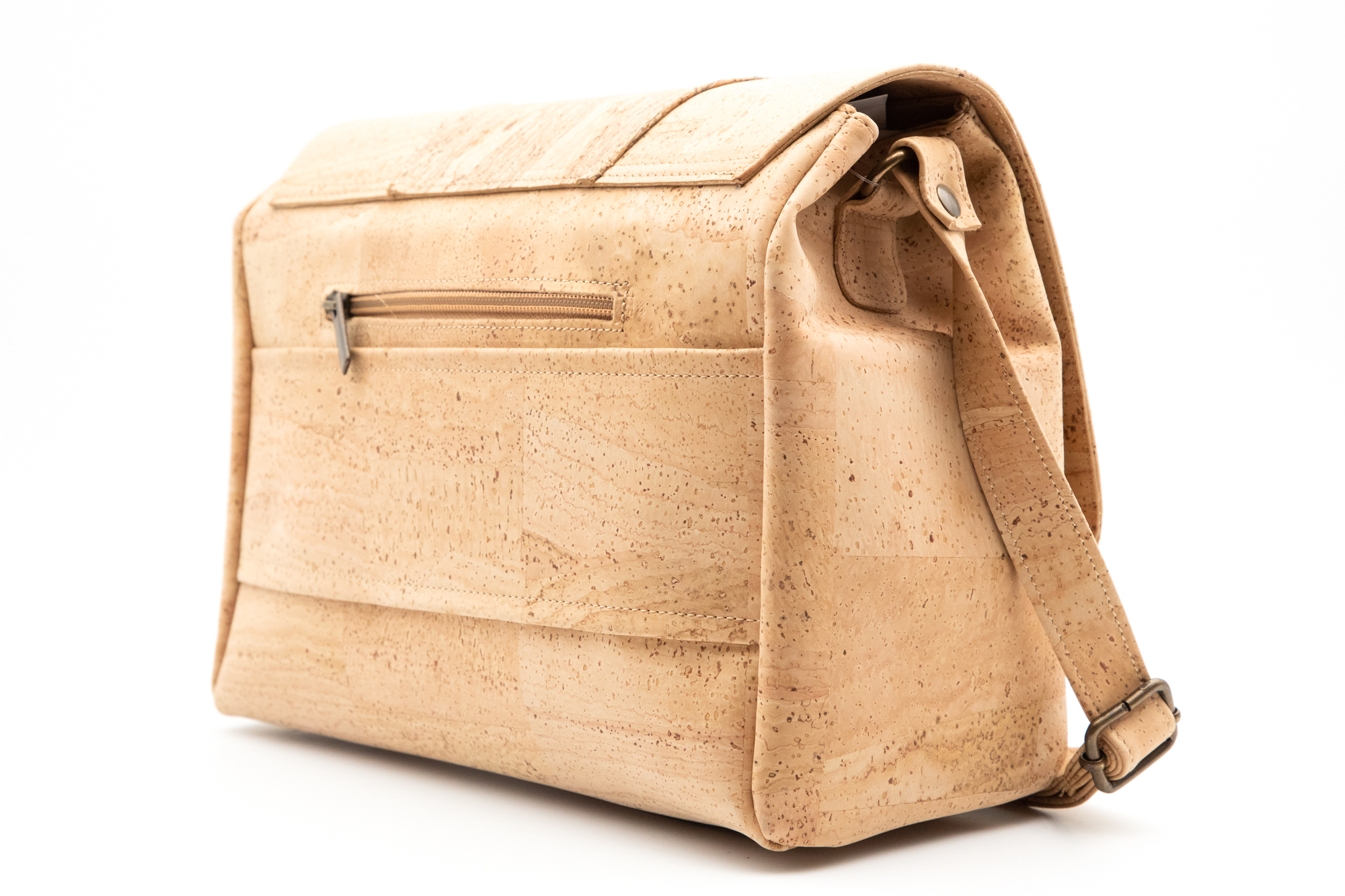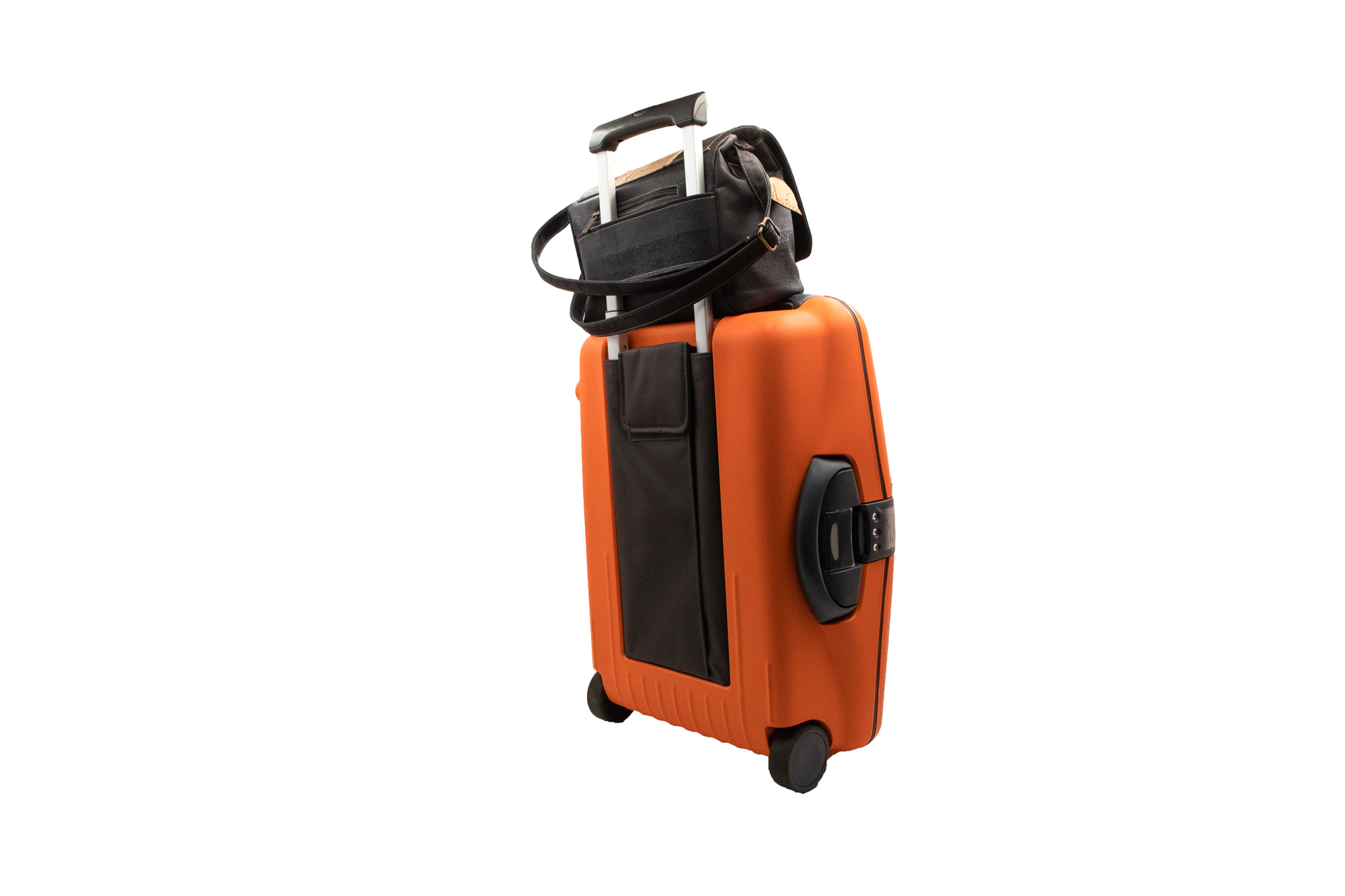No exterior, por trás da mala, tem um bolso com fecho eclair e uma faixa para segurar a mala nas malas de viagem.