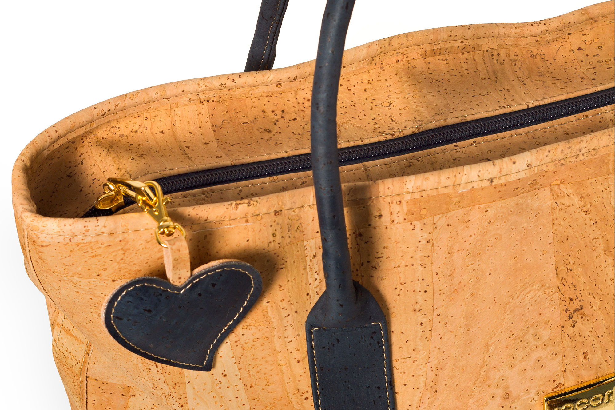 Mala em cortiça, que fecha com fecho eclair, com duas alças.Um bolso de fecho eclair interior, outro para telemóvel e outro para canetas.