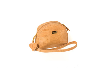 Mala oval em cortiça, com abertura em fecho eclair.Tem uma alça comprida para o ombro, ajustável por fivela
