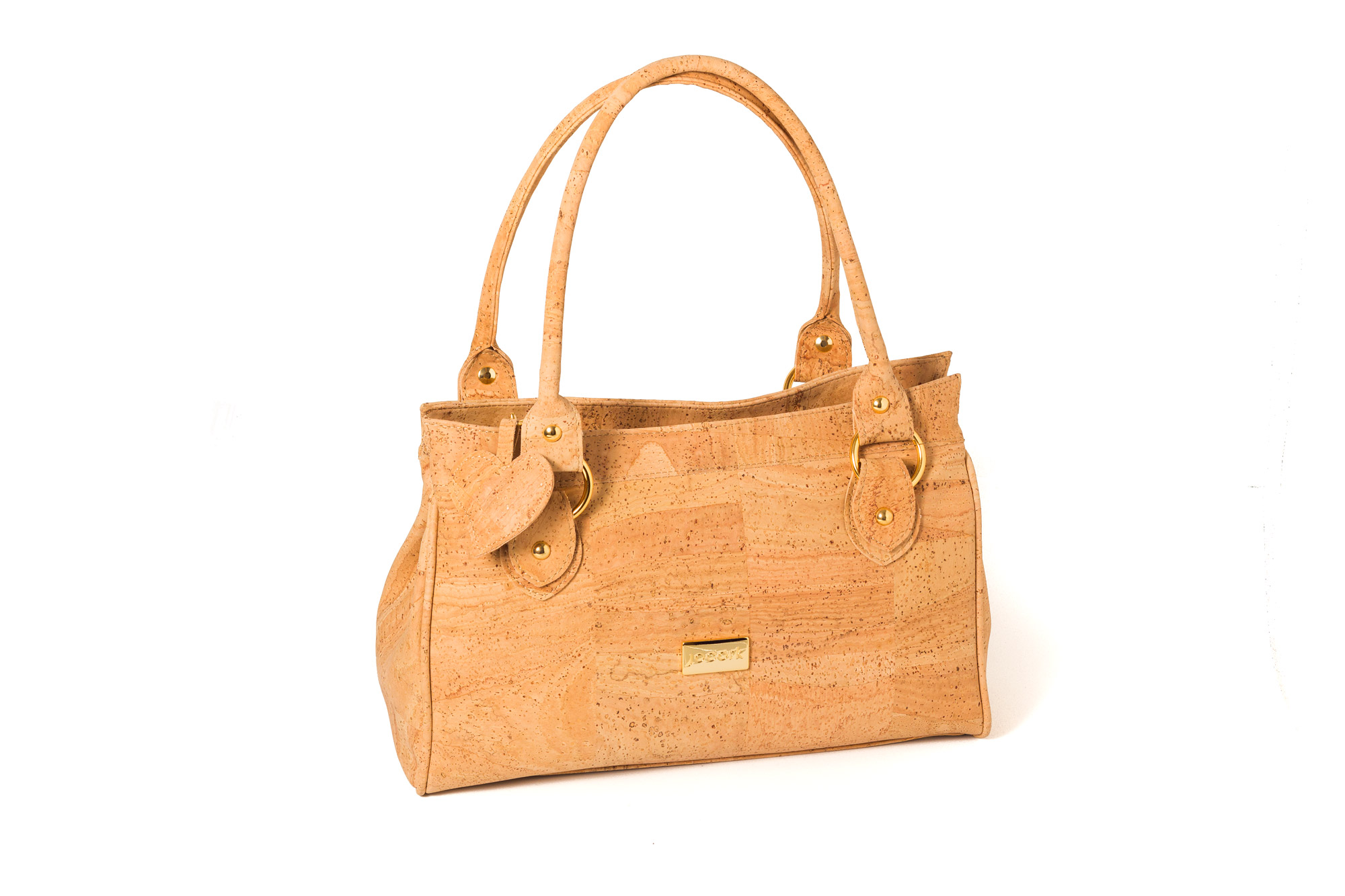 Mala em cortiça de duas alças, com duas divisões, fechadas cada uma com fecho eclair.