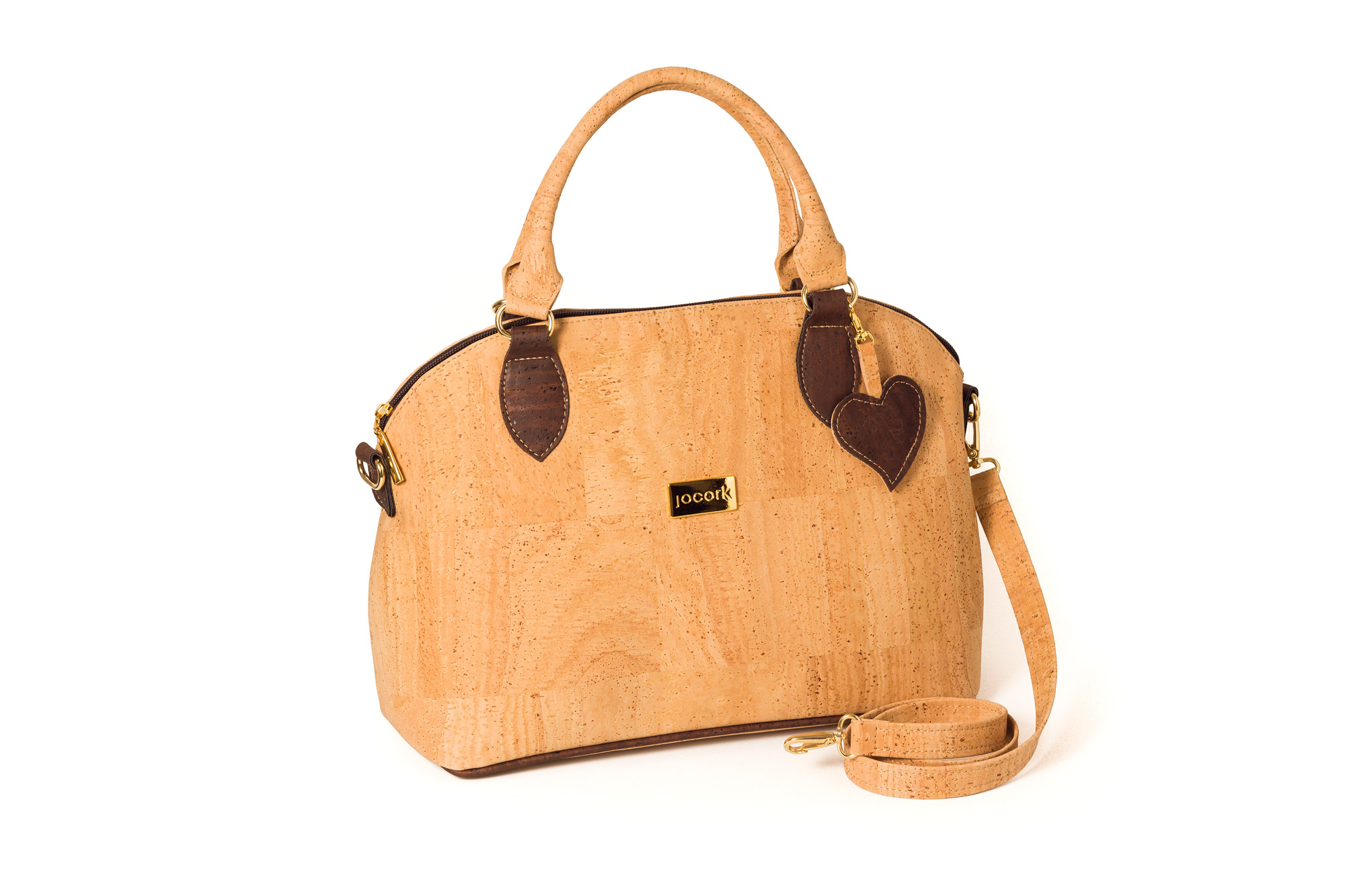 Mala em cortiça, que fecha com fecho eclair, com duas alças de mão e uma alça de ombro que se pode remover.